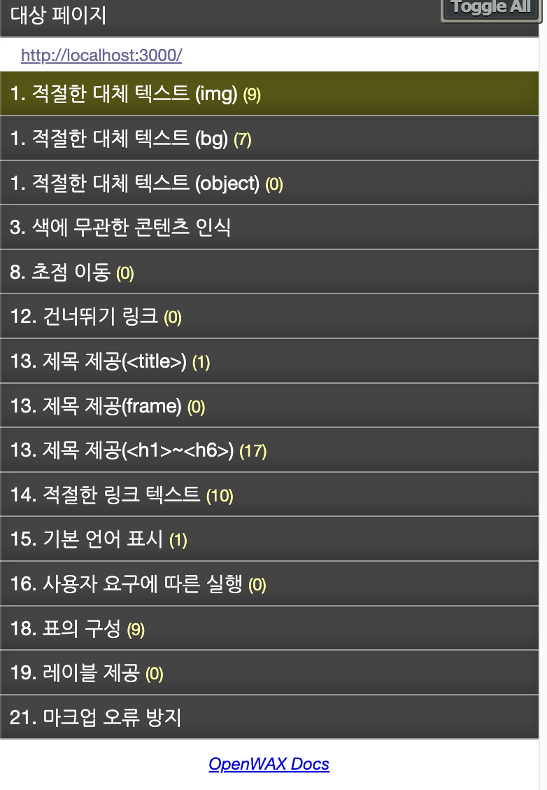 - openWAX 프로그램을 돌려보면 웹사이트 좌측에 접근성에 준수하지 않은 부분이 빨간색으로 뜬다.