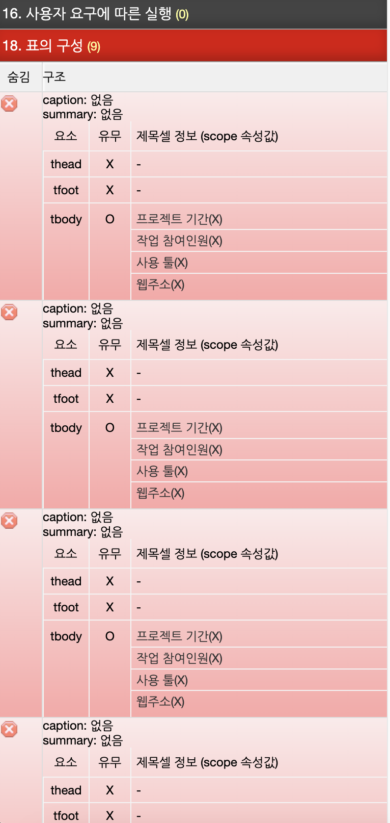 위의 문제는 테이블에 관한 마크업 규칙이 접근성에 맞지 않는 구조라는 의미다.