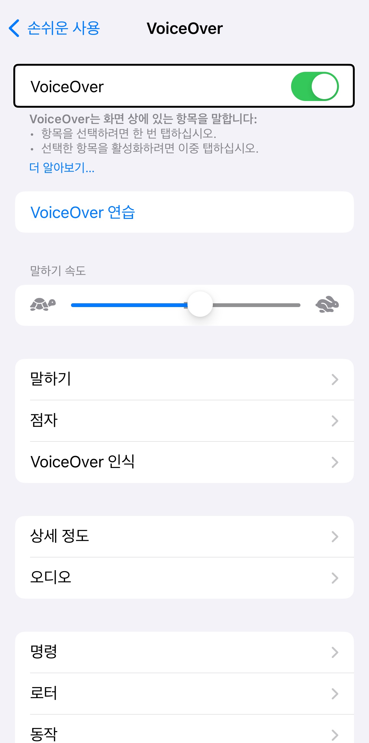 기본 앱 ‘설정’ ➡️ ‘손쉬운 사용’ 메뉴 ➡️ ‘VoiceOver’ 메뉴 ➡️ 'VoiceOver' 토글 탭