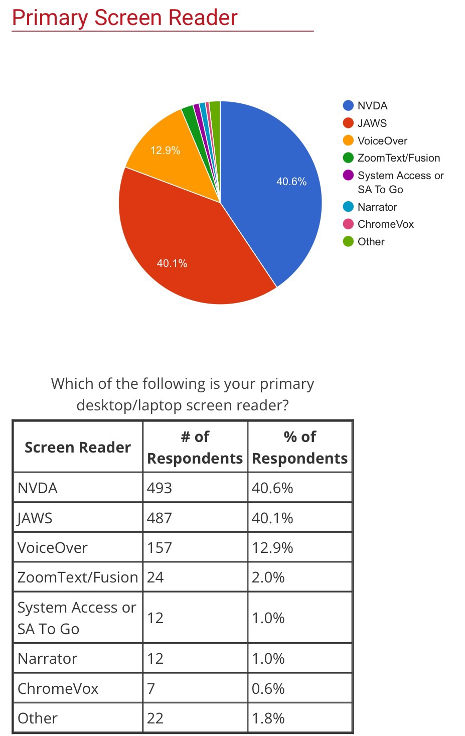 - NVDA, VoiceOver 및 Narrator의 사용량은 지속적으로 증가, 현재 설문 조사 응답자들 사이에서 가장 일반적으로 사용되는 스크린 리더