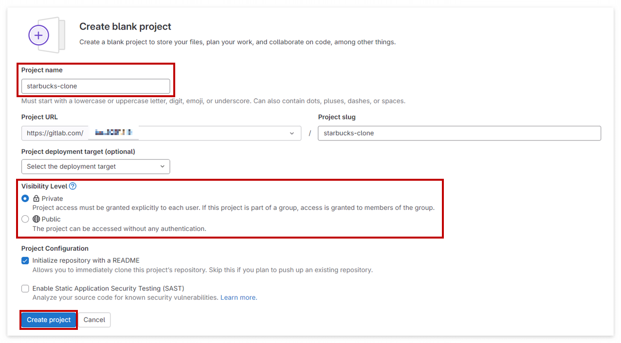 - 프로젝트의 이름과 프로젝트 공개 설정을 Private / Public인지 체크